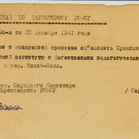 В начале ноября сотрудники пединститута прибыли в Махачкалу. 22 ноября 1941 года издано постановление СНК Дагестанской АССР № 1190/114 «О слиянии эвакуированного Крымского пединститута с Дагестанским пединститутом»: «Ввиду отсутствия возможности для размещения и сохранения самостоятельности эвакуированный Крымский педагогический институт временно слить с Дагестанским пединститутом. Предложить Наркомпросу (тов. Магомедову) пересмотреть штат работников института, исходя из принципа сохранения наиболее ценных научных работников при максимальной экономии государственных средств. Учебное оборудование и имущество Крымского пединститута передать на хранение Дагестанскому пединституту.