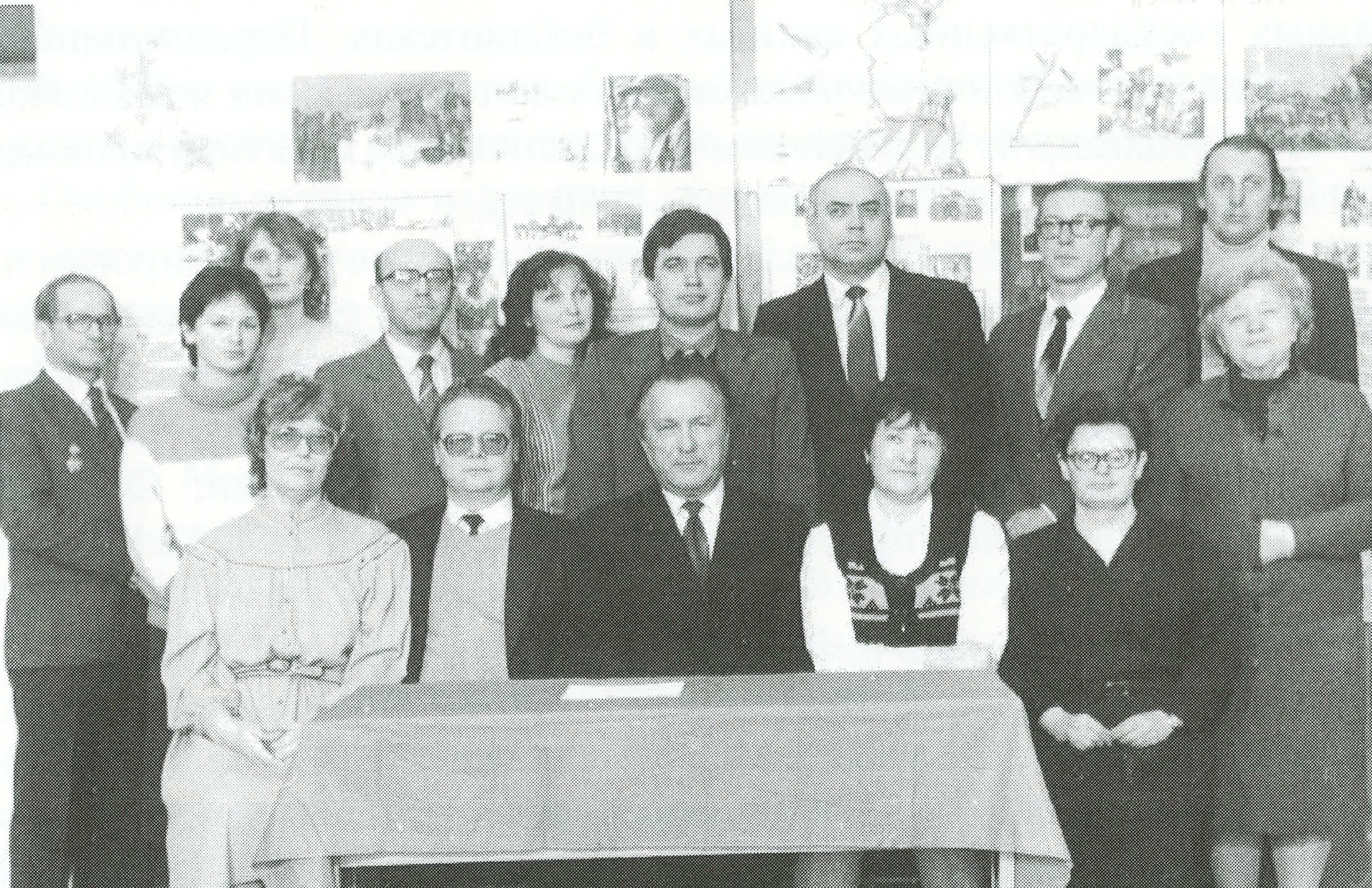 Коллектив кафедры истории СССР СГУ им. М. В. Фрунзе в аудитории-музее Великой Отечественной войны. В первом ряду слева-направо: Т. А. Чебаненко. Н. Е. Дементьев, П. И. Гарчев, Г. В. Сигаева, Л. Л. Кузьмина; во втором ряду: А. И. Кротов, Л. Л. Лалиашвили, И. Н. Герасимова, Н. В. Тимошенко. Н. Ф. Громова, А. С. Шевченко, С. Г. Кащенко, С. Б. Филимонов, П. В. Шаутин. Л. П. Вакатова. Середина 1980-х гг.