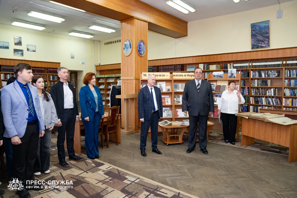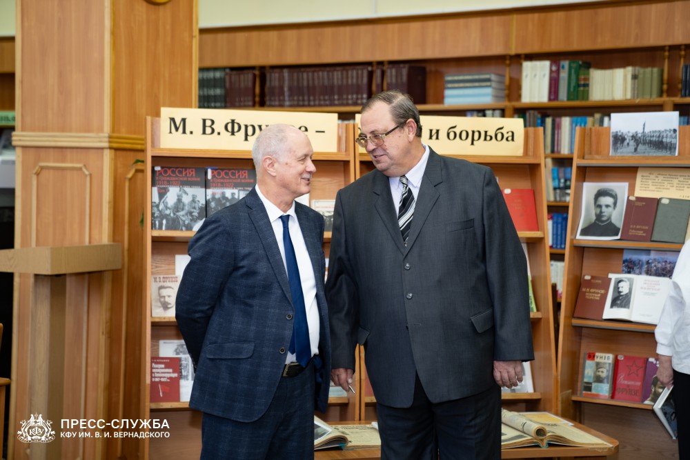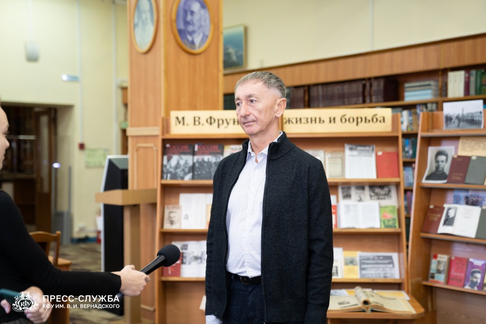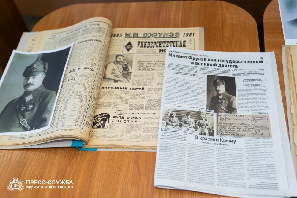 В церемонии открытия выставки принял участие директор Музея истории Крымского федерального университета им. В. И. Вернадского, доктор исторических наук, профессор А. А. Непомнящий. Он акцентировал внимание на том, за какие заслуги профессорская корпорация нашего вуза добилась присвоения имени военачальника университету. «В 1920 году Михаила Васильевича назначили командующим Южным фронтом. Освободив Крым от «белых» войск, он становится здесь главным руководителем Вооруженных сил. Дело в том, что Крымревком в ноябре того же года выступил против существования нашего университета. Тогда профессора во главе с ректором Александром Александровичем Байковым обратились к Михаилу Васильевичу с просьбой защитить вуз. И Фрунзе пошёл им навстречу» – отметил А. А. Непомнящий.