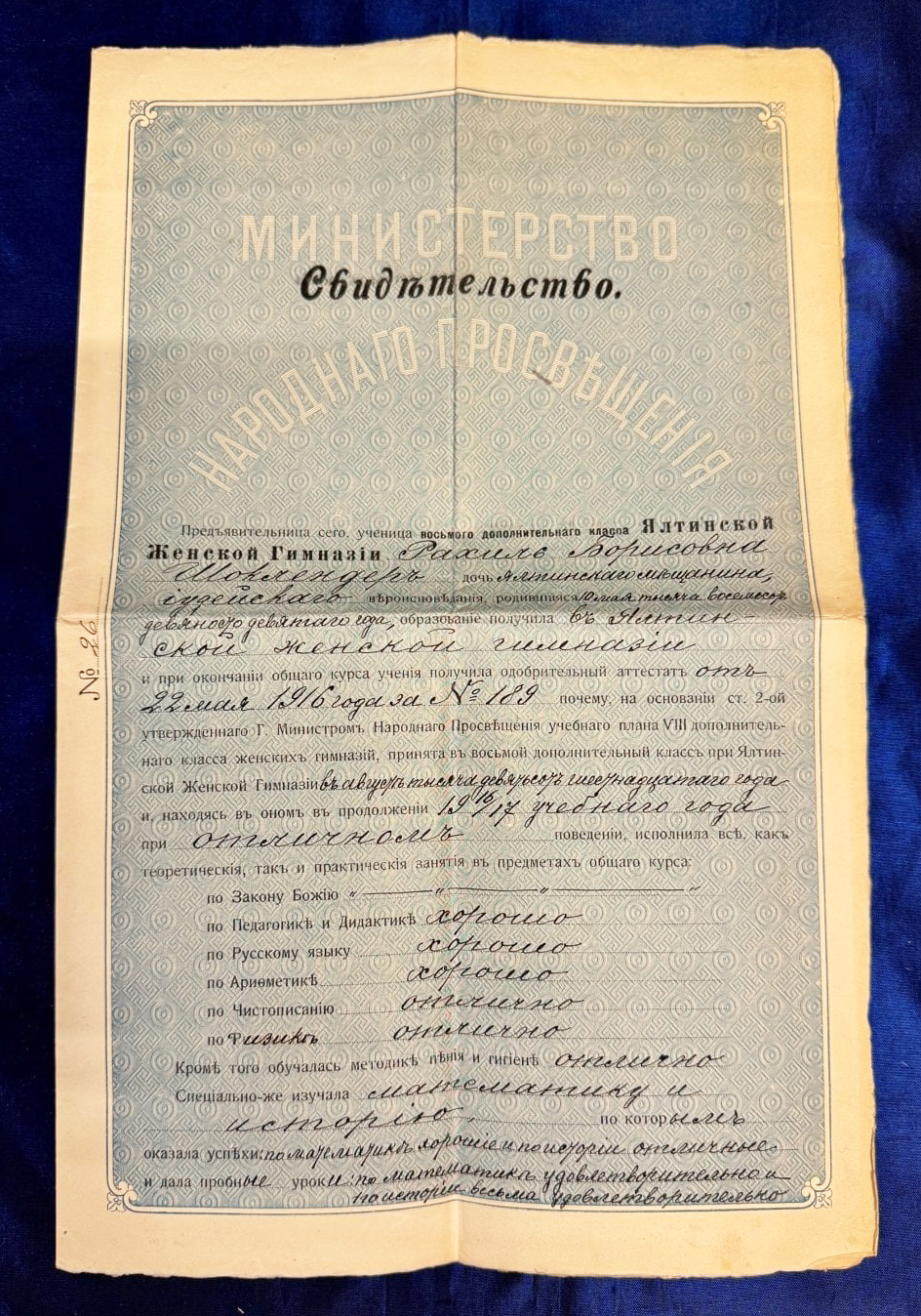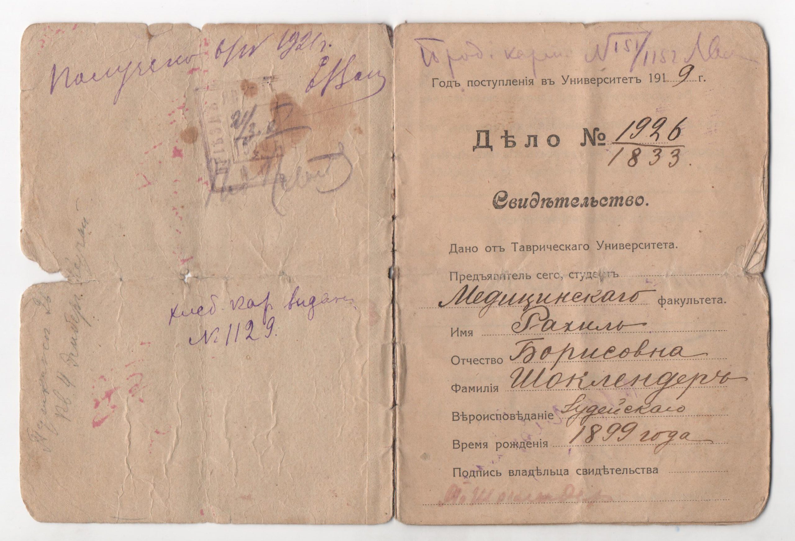 «Свидетельство» выдано Таврическим университетом студентке медицинского факультета Рахиль Борисовне Шоклендер, поступившей в 1919 году. Удалось установить, что она родилась 10 мая 1899 г. в Ялте в мещанской семье, в 1917 г. окончила местную женскую гимназию, получив звание домашней учительницы.