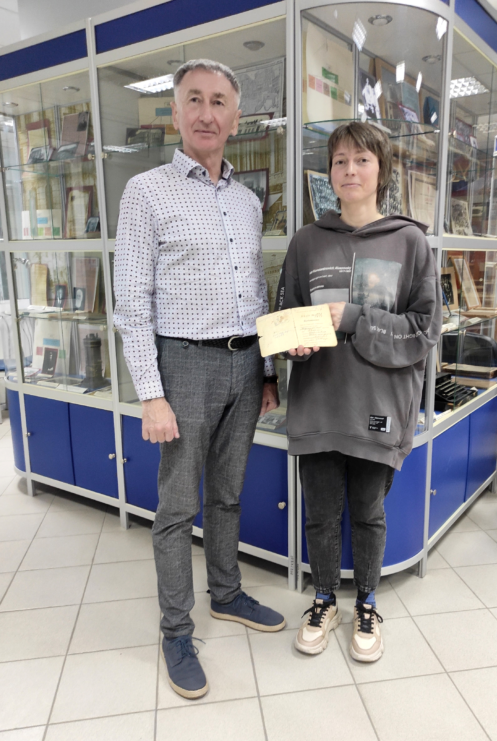 Историк-краевед Артур Вячеславович Лейбенсон и его супруга – кандидат исторических наук, доцент кафедры археологии и всеобщей истории нашего вуза Юлия Тарасовна Лейбенсон передали в дар Музею истории Университета уникальный документ – «Свидетельство» студента Таврического университета, датированное 1919–1922 годами – временем обучения Рахиль Борисовны Шоклендер, 1899 г. р. Данный документ служил в неспокойное время революционных катаклизмов и частой сменяемости власти аналогом паспорта, удостоверяющего личность. «Свидетельство» удостоверяло что предъявитель является студентом Таврического университета «для свободного проживания в городе, пригороде и других местах Крыма». Уникальное и бесценное для истории нашего вуза «Свидетельство» было выкуплено семьей Лейбенсон на интернет-аукционе специально для передачи в музей.