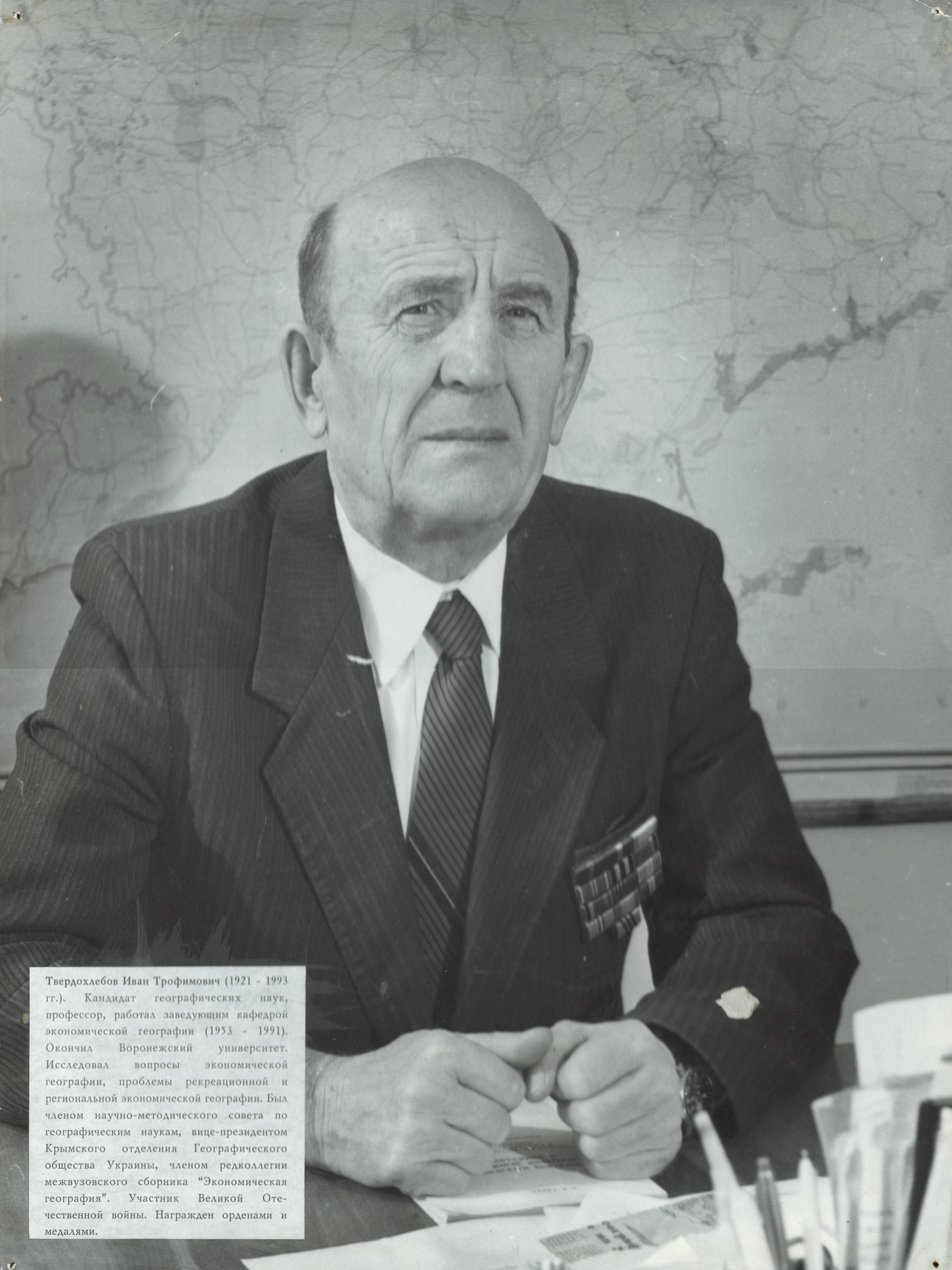 Твердохлебов Иван Трофимович родился в с. Айдар Ровеньского района Белгородской области. Окончив с отличием семилетнюю школу в г. Россошь Воронежской области, поступил в 1938 г. в Россошанское педагогическое училище, где обучался до 1941 г. После ускоренного курса в артиллерийском училище летом 1942 г. в качестве командира взвода участвовал в боях на Калининском фронте. За годы войны был тяжело ранен, удостоен ордена Красной звезды. В 1945–1947 гг. обучался на заочном отделении географического факультета Воронежского госуниверситета, совмещая учебу с преподавательской работой в Россошанском учительском институте и Россошанском педучилище. В 1948 г. поступил в аспирантуру при Ярославском педагогическом институте им. К. Д. Ушинского. Результаты научных исследований изложены в диссертации на соискание ученой степени кандидата географических наук, защищенной в 1952 г. в диссертационном совете при Институте географии АН СССР. В том же году направлен на работу в Крымский государственный педагогический институт им. М. В. Фрунзе. В 1957 г. утвержден в звании доцента, в 1974 г. – в звании профессора кафедры экономической географии. В 1953 г. избран заведующим этой же кафедрой, которую он возглавлял до 1991 г., когда по состоянию здоровья был вынужден перейти на должность профессора-консультанта. Основатель крымской научной школы рекреационной географии. Педагогическая и научная деятельность И. Т. Твердохлебова отмечена высокими наградами: орденом «Знак Почета» (1971), знаком «Высшая школа СССР: За отличные успехи в работе» (1981), Грамотою Президиума Верховного Совета УССР (1990).