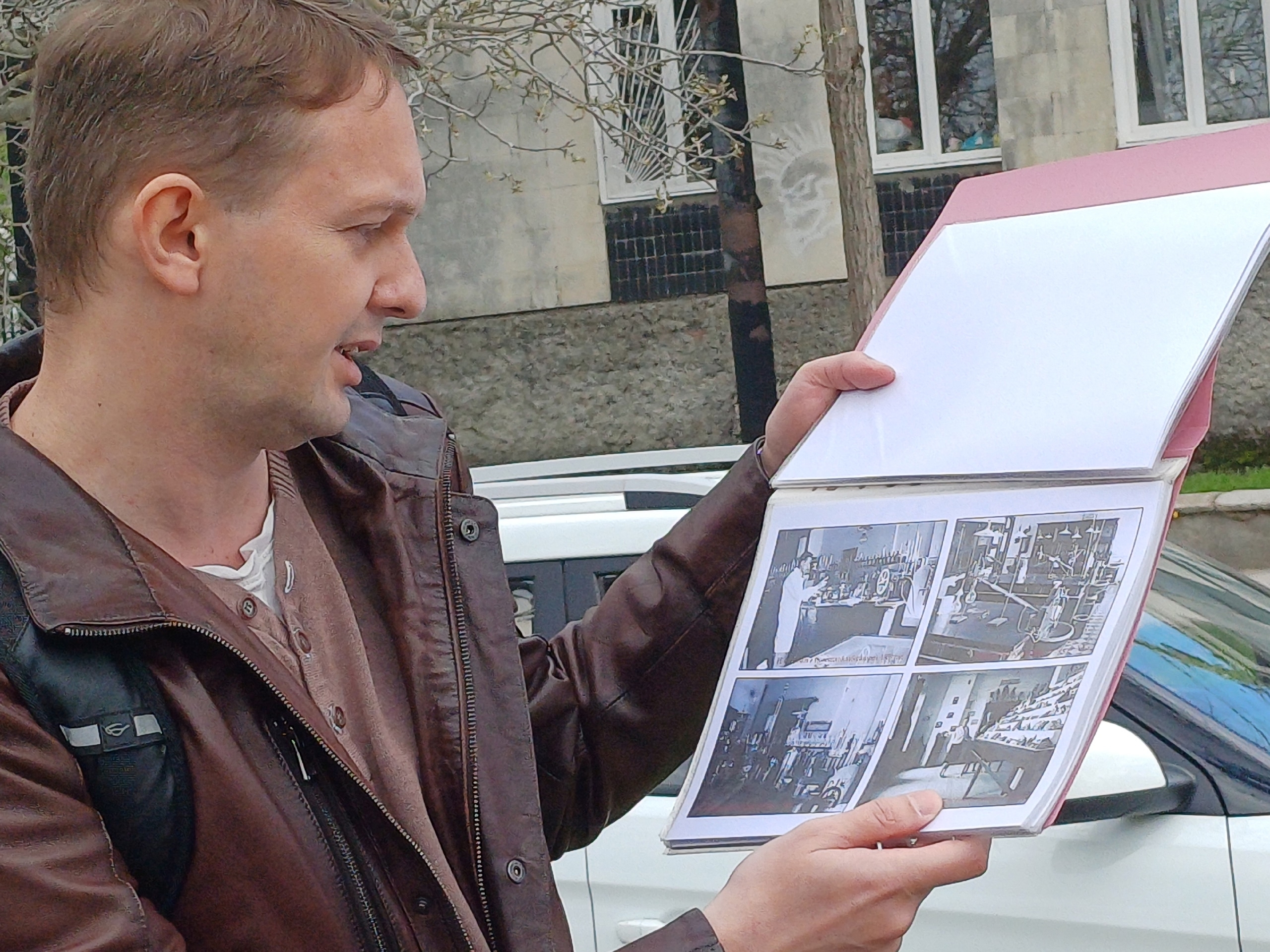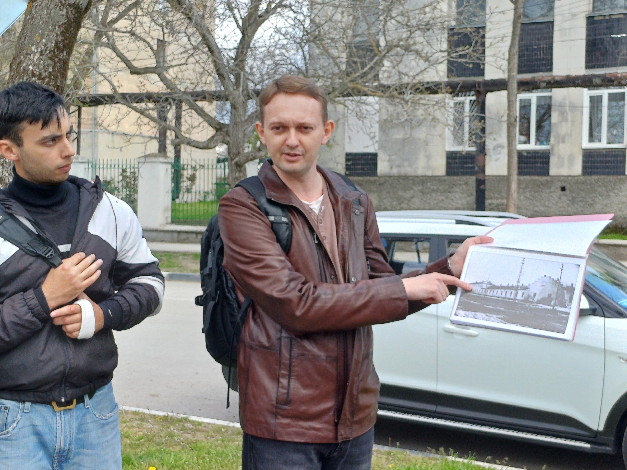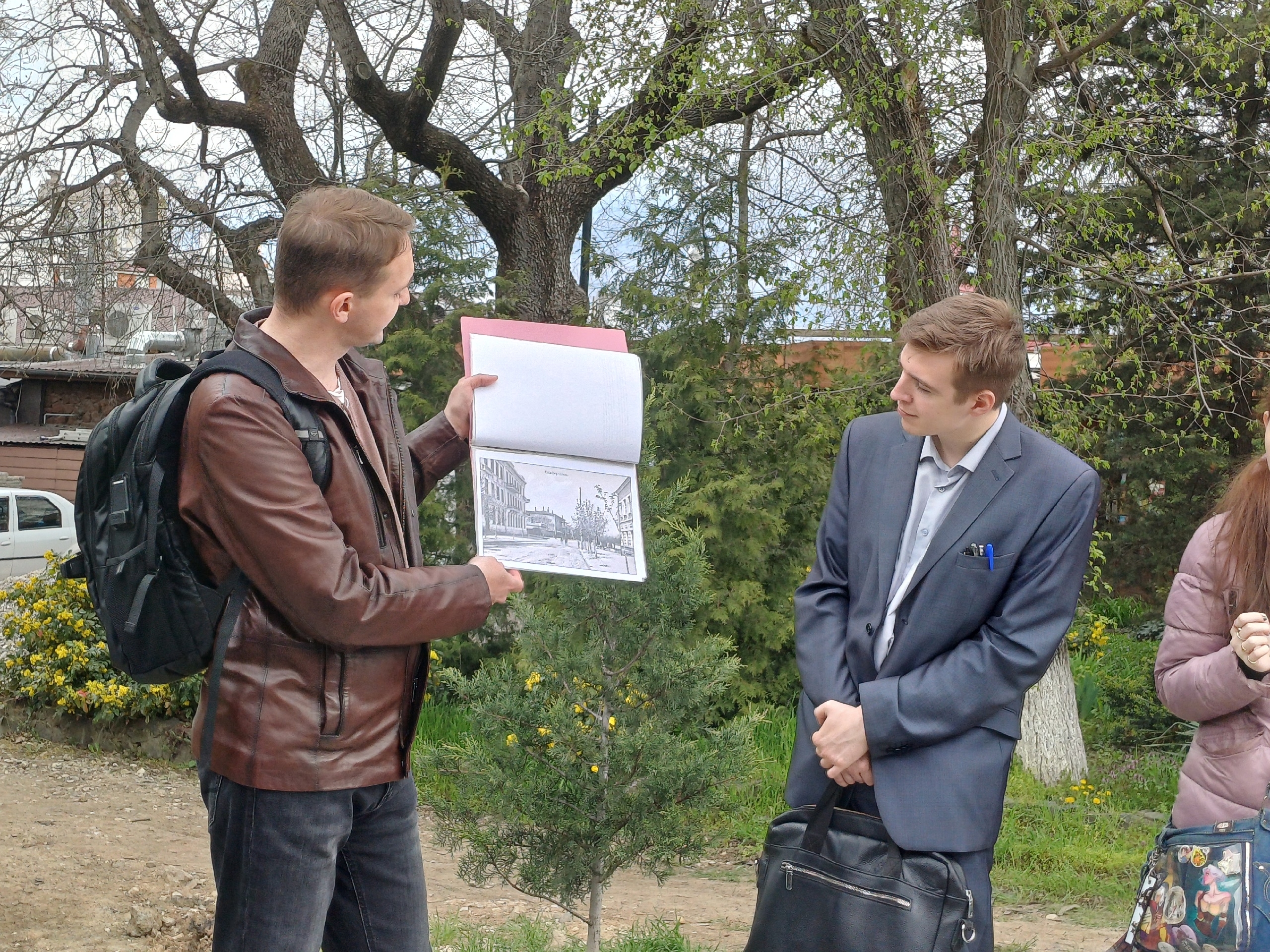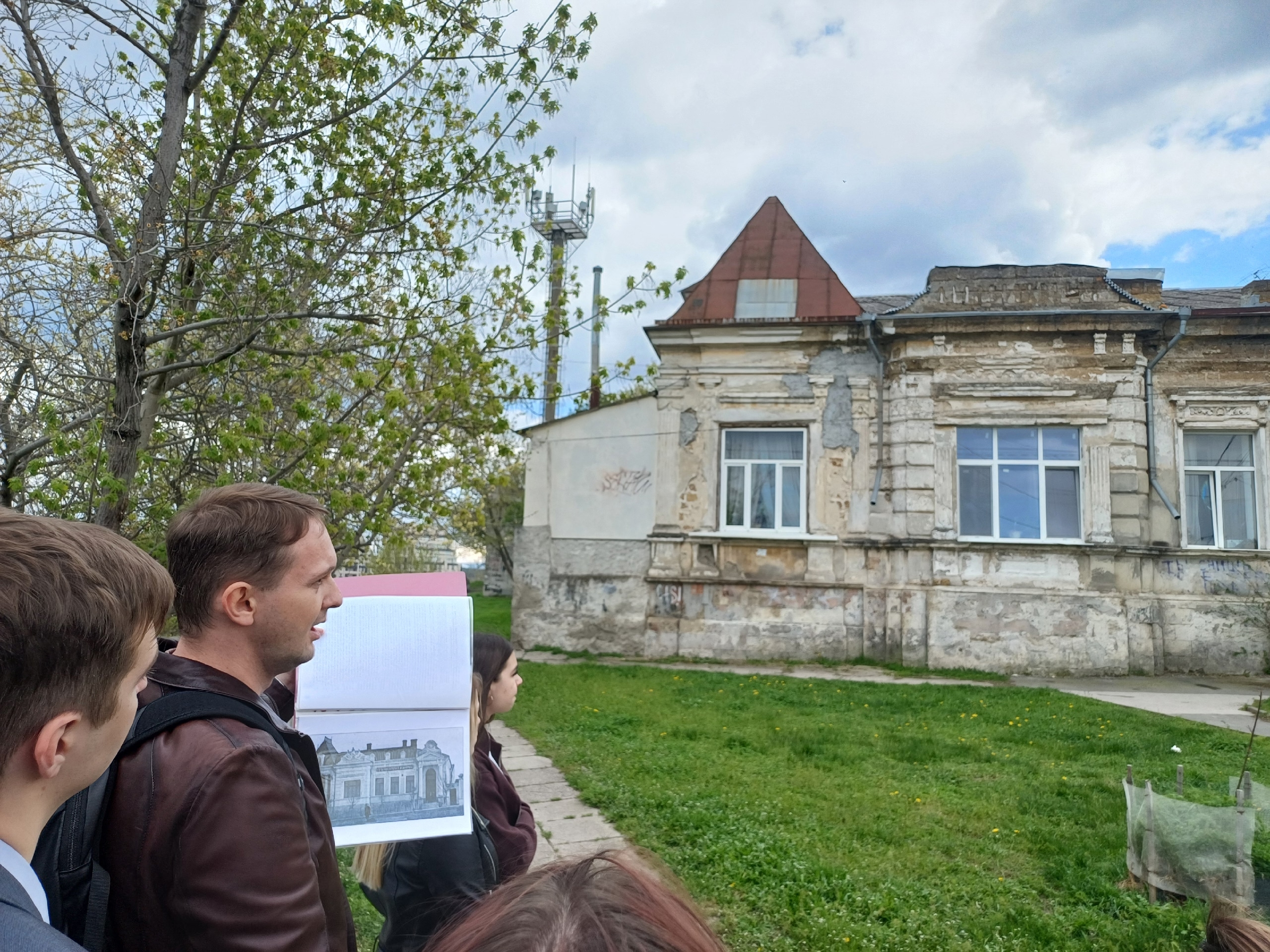 Экскурсия по первым корпусам Таврического университета была проведена в исполнении кандидата исторических наук, заведующего фондовым отделом Музея истории нашего вуза Дмитрия Анатольевича Ломакина. Повествование началось на ул. Лазаретной, на площади им. Р. И. Гельвига – в центре студенческой жизни 20-х годов ХХ века, участники мероприятия попытались представить, как выглядели «Суворовские» казармы, на месте которых сейчас раскинулись тренировочные залы факультета физвоспитания. Побывали на Макуринской горке – бывшем особняке В. М. Макурина, где в 1920-е – 1930-е годы располагался химический факультет, спустились по Лазаревской улице и узнали историю знаковых зданий – гимназии В. А. Станишевской, Дома губернатора, Дома Ш. В. Дувана, на самом деле состоящего из трех отдельных городских особняков конца XIX века.