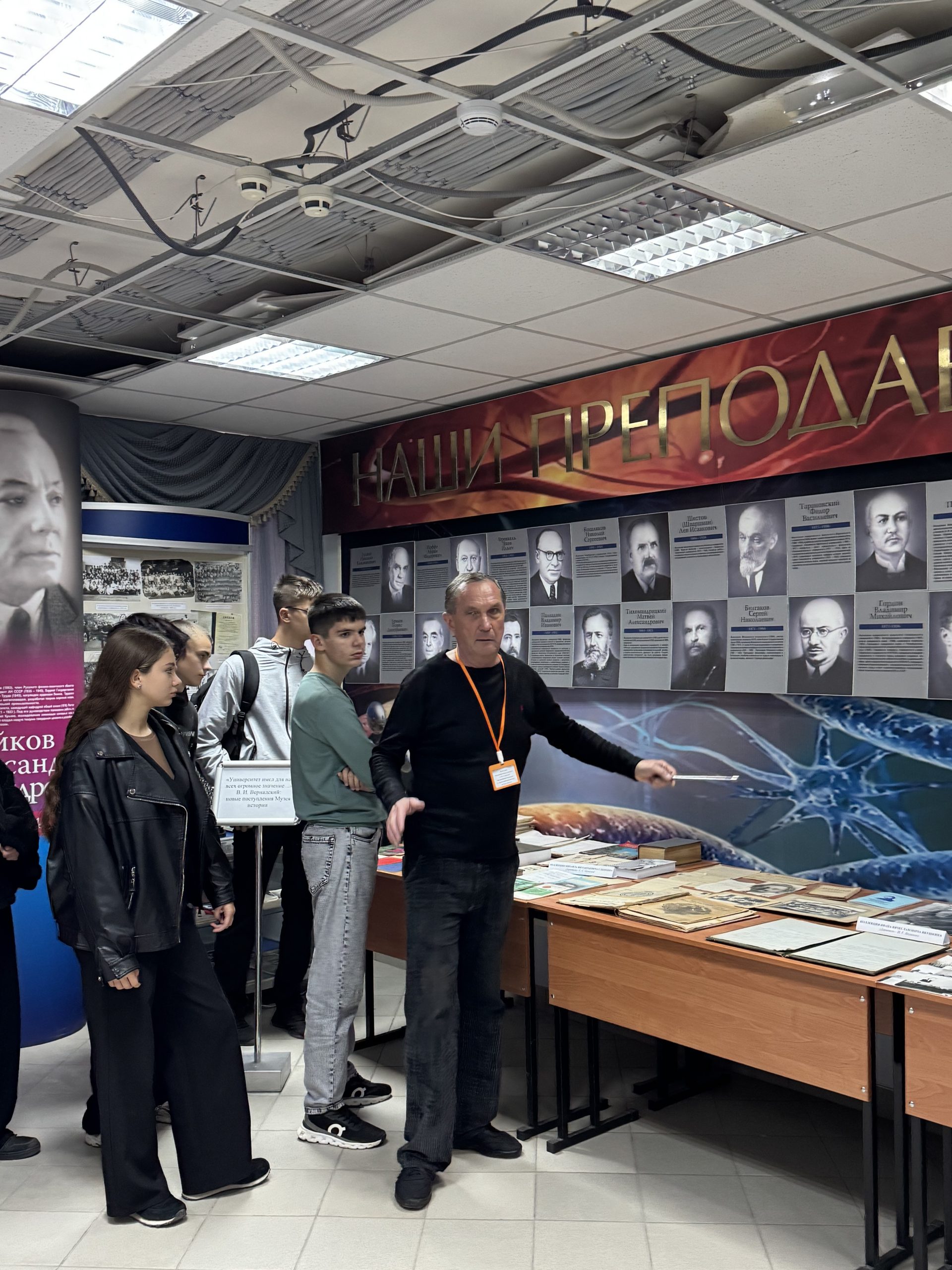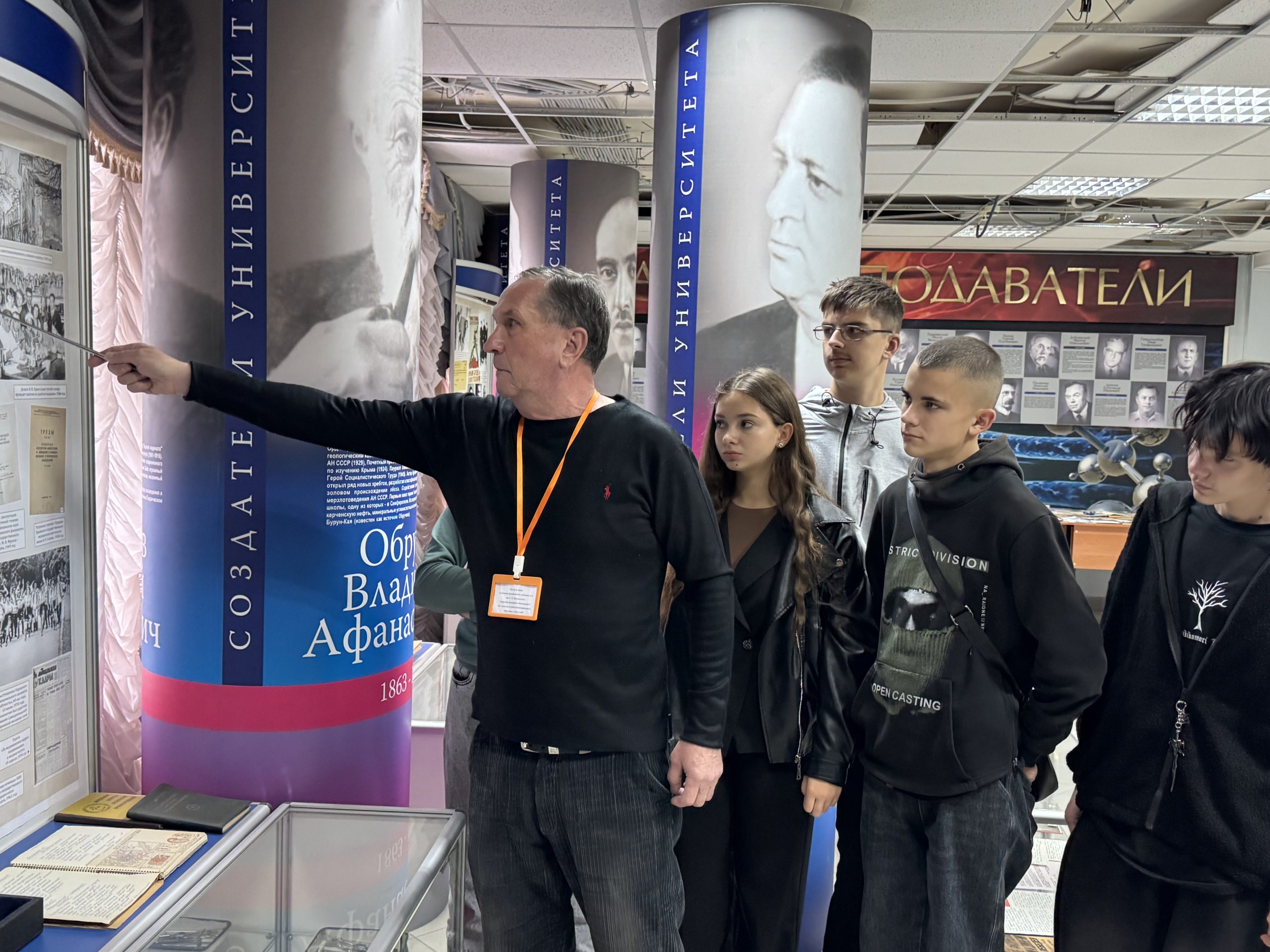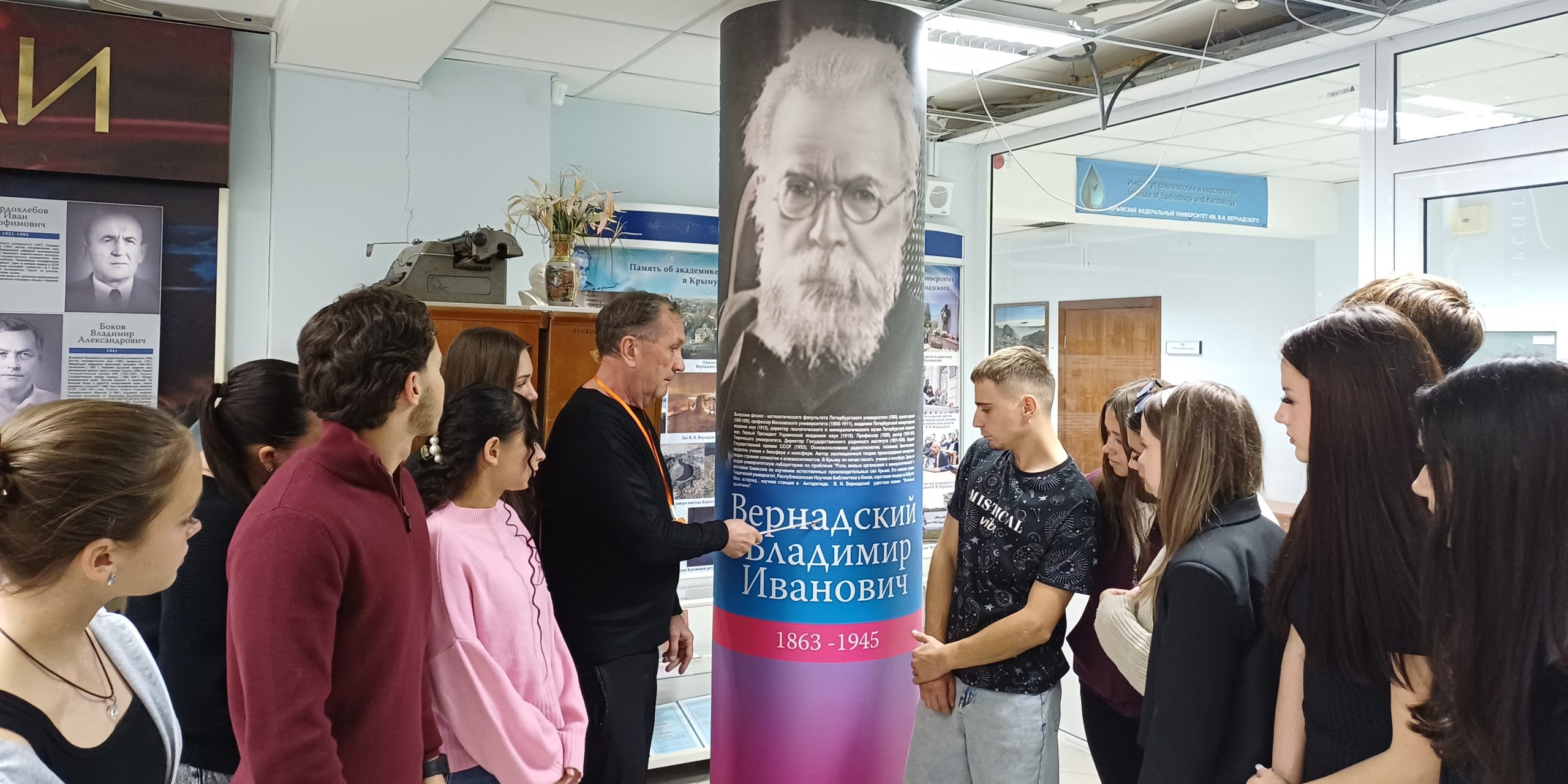 Заведующий отделом музейно-образовательных программ и экскурсий Музея В. А. Герасимов познакомил обучающихся с основными этапами более чем вековой истории нашего вуза, более детально остановившись на 20–30-х гг. ХХ века – периоде образования и становления первого университета на территории Крымского полуострова.