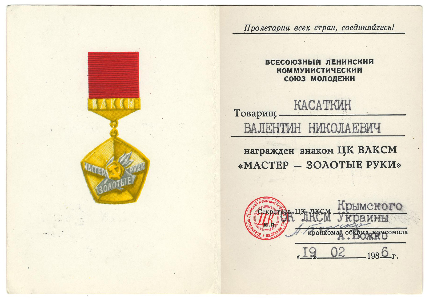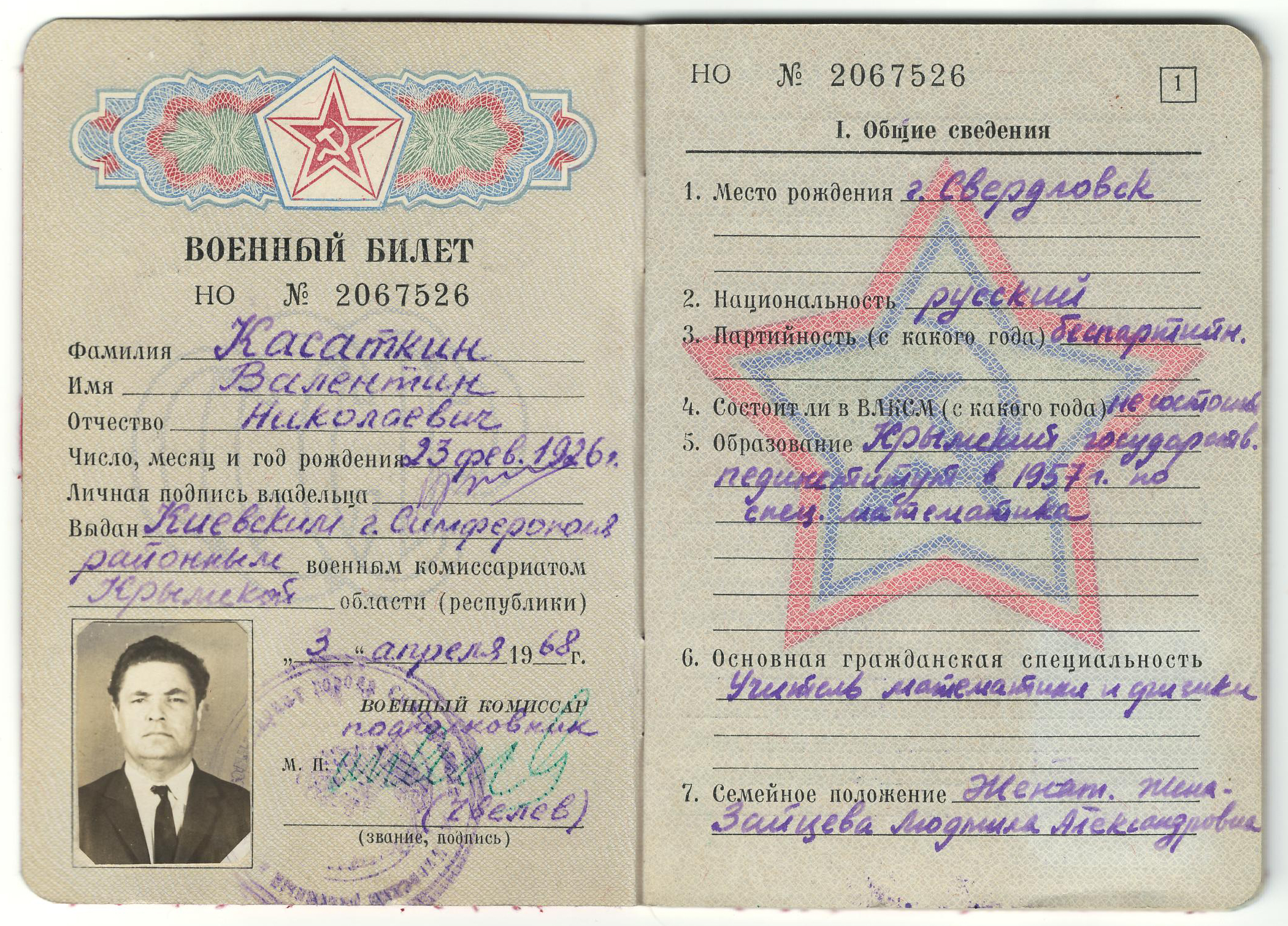 Валентин Николаевич Касаткин родился 23 февраля 1926 г. в г. Свердловске в семье горного инженера. После переезда в Большую Ялту в 1935 г. он с семьей жил в Симеизе, потом – в Ялте, где в 1941 г. окончил семилетнюю школу. В начале Великой Отечественной войны вернулся на Урал к отцу. Он учился и работал в г. Шадринске электромонтером, затем – дежурным щита управления на местной электростанции.